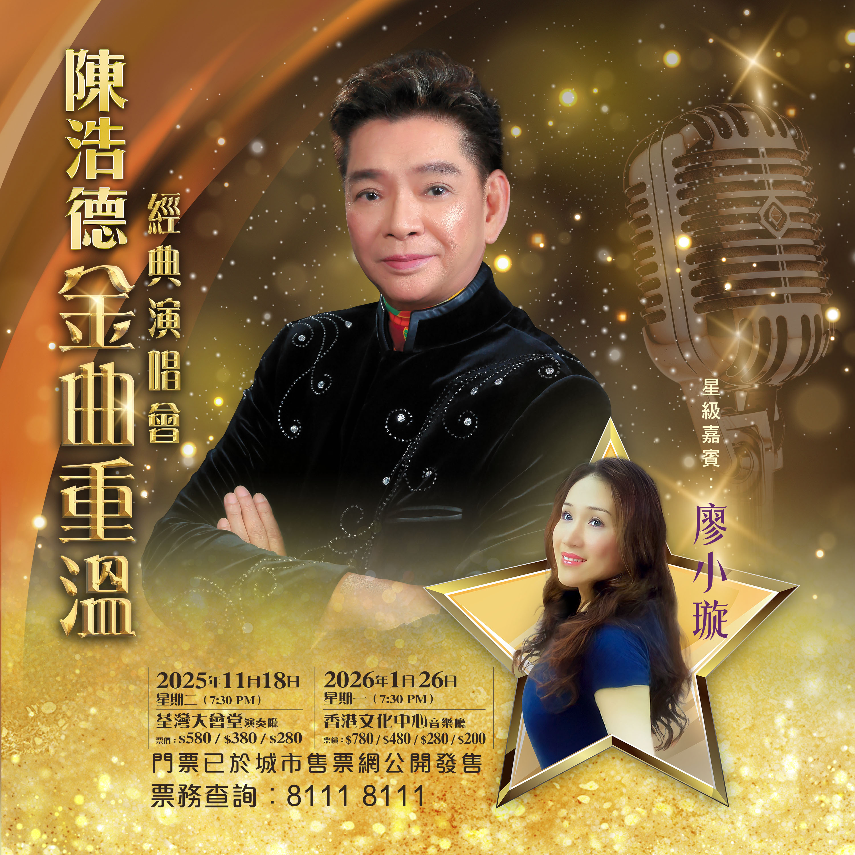 跨越半世紀歌壇情懷,匯聚一夜經典旋律,唱盡流行歲月的感動! 興趣可以是短暫的,但真正的熱愛卻能歷久不衰。陳浩德(Peter Chan),人稱「德哥」,正是這份鍾愛的最佳典範。自1973年推出首支粵語歌曲《悲秋風》以來,德哥從未停下歌唱的腳步,五十多年來始終堅持初心,以歌聲感動無數樂迷。 由髮型酷似英國金童子 Cliff Richard 而獲封「香港金童子」之名,陳浩德憑《囑咐話兒莫嫌煩(分飛燕)》與甄秀儀合唱一鳴驚人,其後推出《勁草嬌花》、《春花秋月》、《月是故鄉明》、《禪院鐘聲》、《暢飲在今宵》等多首膾炙人口的金曲,成為七十年代粵語流行樂壇的重要人物。短短三年間,他推出逾十張粵語專輯,屢創金唱片銷量佳績。 隨著懷舊風潮興起,「香港金童子」的經典作品再度被新世代翻聽、翻唱,德哥亦順理成章成為「金曲金童子」,被譽為『流行經典金曲』的重要原唱者之一。他的歌迷會專頁在社交平台上活躍不斷,演出場次更是遍佈大小舞台,人氣不減,魅力依舊。 2025年,陳浩德迎來入行第52個年頭,特別舉辦《金曲重溫》經典演唱會,歷年首本名曲傾巢而出,以熟悉嘅歌聲,帶你重溫那些年我們一起聽過的旋律,回饋樂迷多年來的支持。演唱會更隆重邀請濶別舞台多年的星級嘉賓——廖小璇小姐驚喜登場,為這場屬於回憶與感動嘅音樂盛宴添上亮麗色彩。